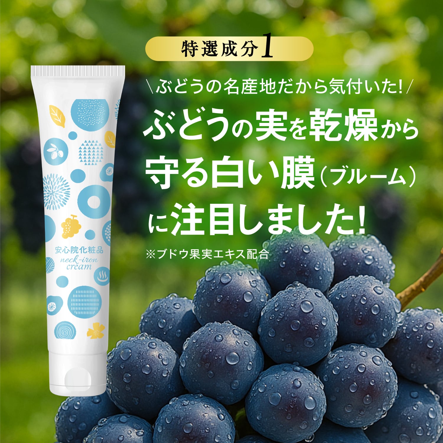 安心院化粧品の「ネックアイロンクリーム」は、首のシワに真剣に向き合う皆様のために、首のマッサージの効果を最大限に引き出すための特別な処方でお作りしました。